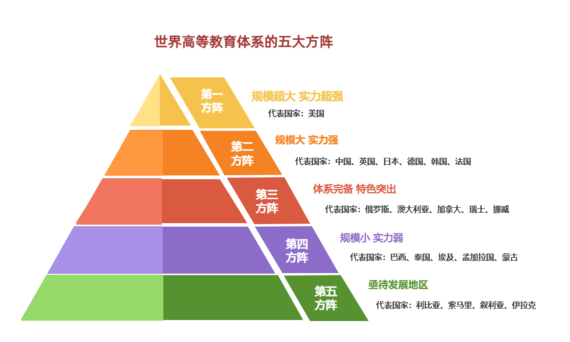 “高等教育强国指数2025”显示,世界高等教育五大方阵的基本格局没有改变,但国家位次有所不同,整体仍呈金字塔结构,美国仍处于难以撼动的塔尖地位。中国相较于去年有所提高,正逐步追赶,努力缩小差距。